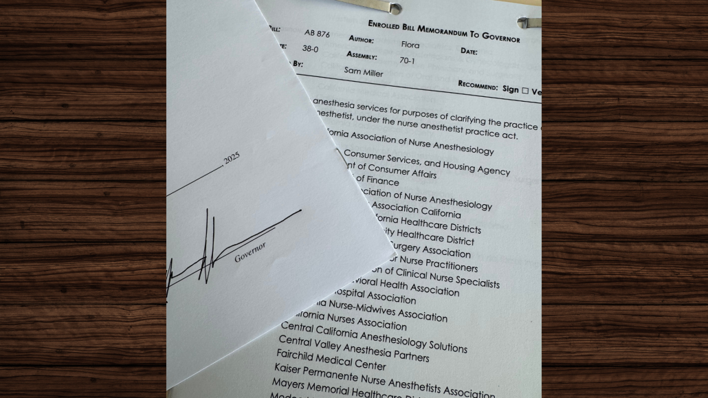 (SACRAMENTO, CA) –Today, Governor Gavin Newsom signed AB 876 (Flora) into law, reaffirming Certified Registered Nurse Anesthetists’ (CRNAs) essential role in the state’s health care system. The legislation codifies current, safe, and effective practices, ensuring CRNAs can continue delivering high-quality anesthesia care independently, thereby strengthening patient access, workforce stability, and health care equity.