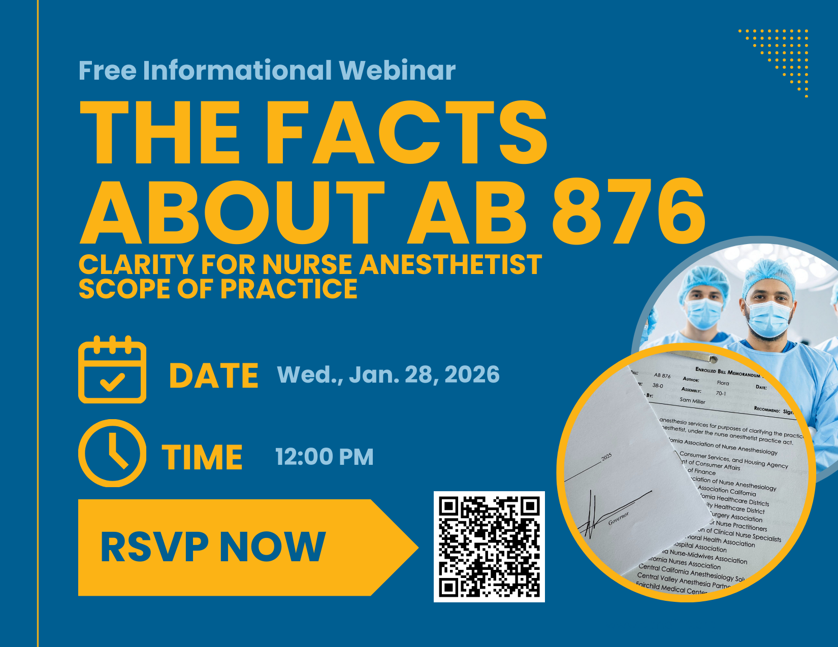 Now signed into law, AB 876 (Flora, 2025) re-affirmed CRNAs’ long-standing legal authority to deliver anesthesia care independently. By strengthening the Nurse Anesthetist Act, AB 876 increases access to essential anesthesia services across the state. Attend this free informational webinar on Jan. 28th at 12pm Noon to get the facts from the bill’s author Asm. Heath Flora, Katherine A. Bowles, RN, Esq., sponsor, and other key stakeholders.